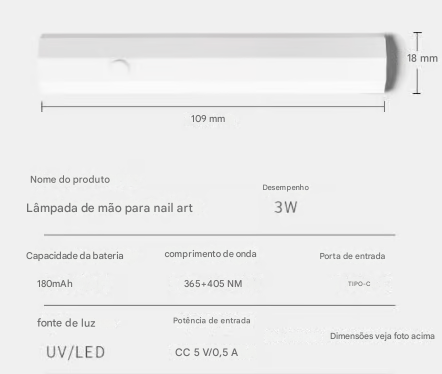 - 💅 Luz UV: Mini e portátil / Secagem rápida / Design portátil. Ligue a lâmpada. Aponte a luz diretamente para a unha.