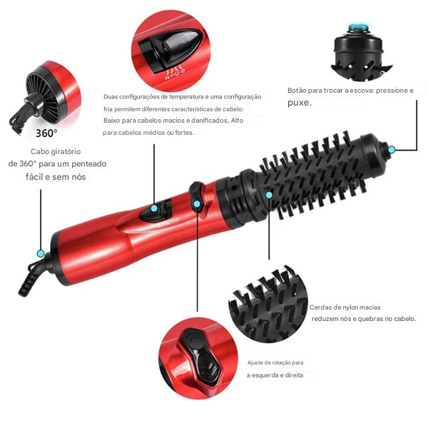 Três ajustes de temperatura, quente/morno/frio, atendem às necessidades de diferentes estilos de cabelo. O mecanismo giratório da escova do secador de cabelo permite a rotação em duas direções, proporcionando um amplo movimento de ondulação e ajudando a criar um efeito de ondulação natural.